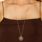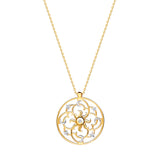 Yellow Gold, White Gold and Diamonds. The 14 karat gold pendant necklace is a representation of the galaxy with the bright sun in the centre.