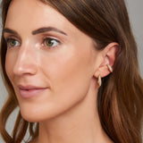 A gold ear cuff featuring white topaz stones. Its subtle wave design imbues you with elegance and adds an extra glow to your ear game. Wear this ear cuff with the Athena Hoop Earrings or with any of our gold earrings.