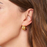 A magical and glamorous pair of gold earrings. These gold hoops feature white and blue topaz stones set in moons, stars and evil eye protection symbols. These gold earrings imbue you with magic and sparkle. Team these earrings with the matching Magic Pendant or any Essential Gold Necklace from our collection.