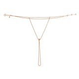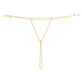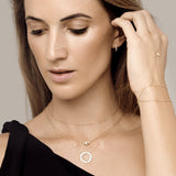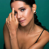 The fine and elegant 14k gold chain lays across the hand and delicately loops around the finger. You will be surprised how comfortable this bracelet is. Its minimalistic design features a triangle in the centre and is best worn solo.