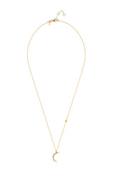 This diamond pendant is inspired be the crescent moon and adorned with 9 handset sparkling diamonds. Above the moon, there is a diamond sparkling which is set in a little gold star, a perfect match for the mystical moon necklace.