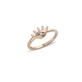 This 14 karat gold diamond ring is our dream jewelry piece. The turquoise stone in the center of the eye is encased with pave set diamond lashes. A magical gold ring that lasts a lifetime.